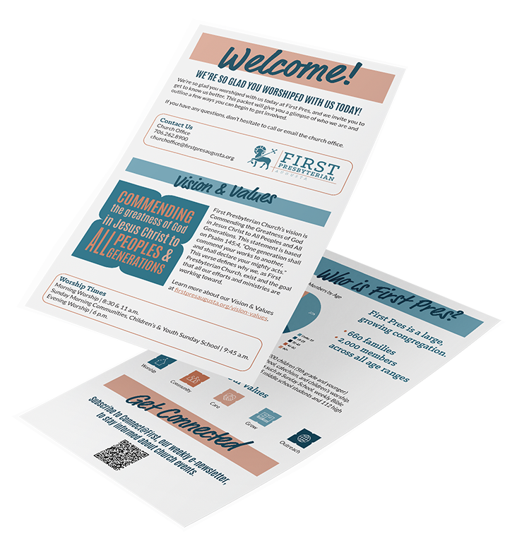 All materials created for the church adhere to the First Pres brand guidelines. These guidelines were in place when I started, but I've since expanded upon them to develop a visual language that is easily understood and familiar to church members. These guidelines apply to all materials, including business cards, posters, flyers, emails, and brochures.