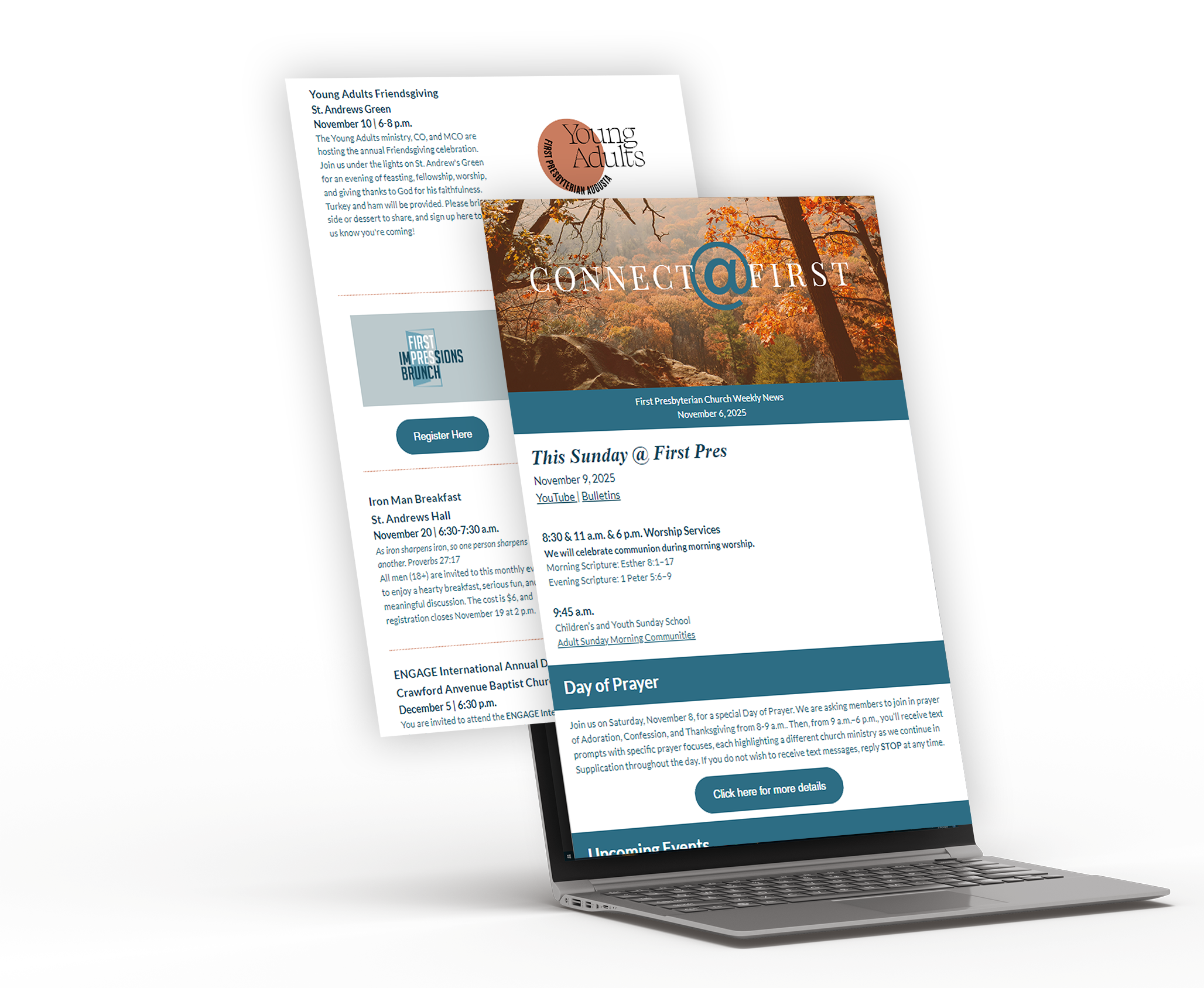 Event promotion at First Pres encompasses a broad age range. One day, I'm designing for the entire congregation of over 2,000, while others focus on children or women. Consequently, no two projects are alike.