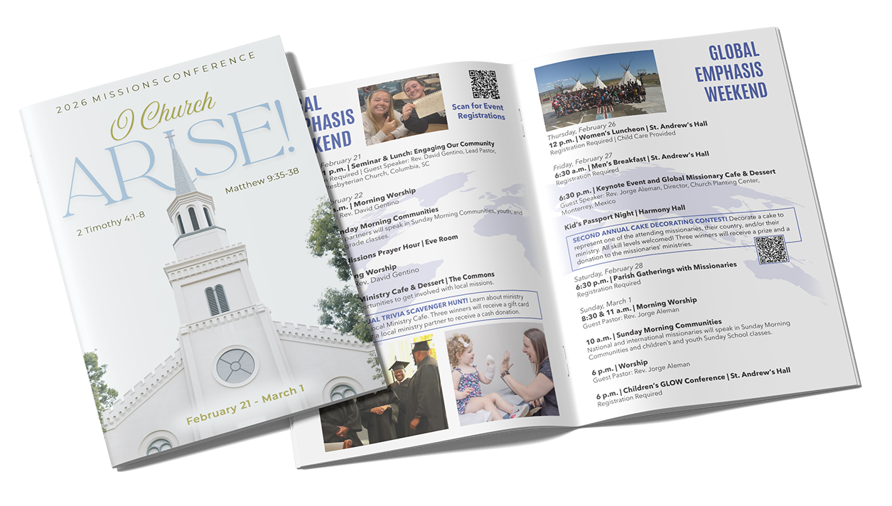 Specific large-scale events, like the Missions Conference pictured above, receive their own guidelines that differentiate the event while still maintaining elements of the existing First Pres brand.